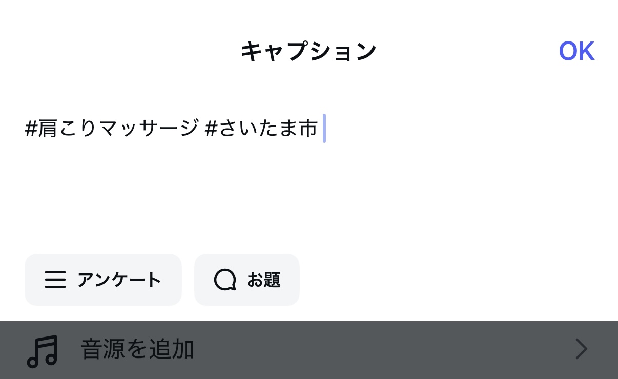 例えば「#さいたま市」「#肩こり」といった、地域名とジャンルや、あなたのサロンが特化している施術などを最低限、投稿のキャプション(本文)につけておくと良いです。あくまでアカウントのジャンルをInstagramに認定してもらう目的で使用します。